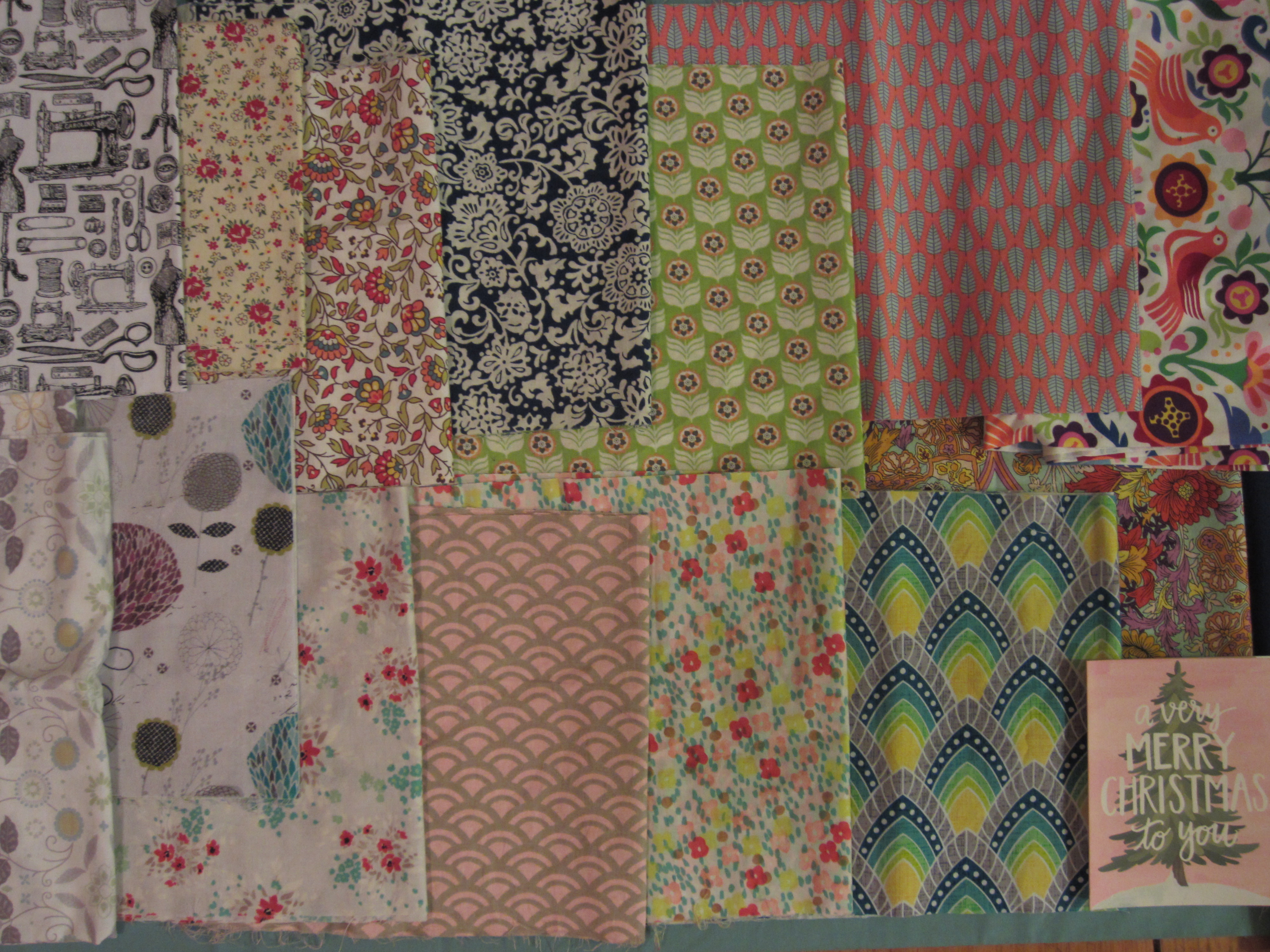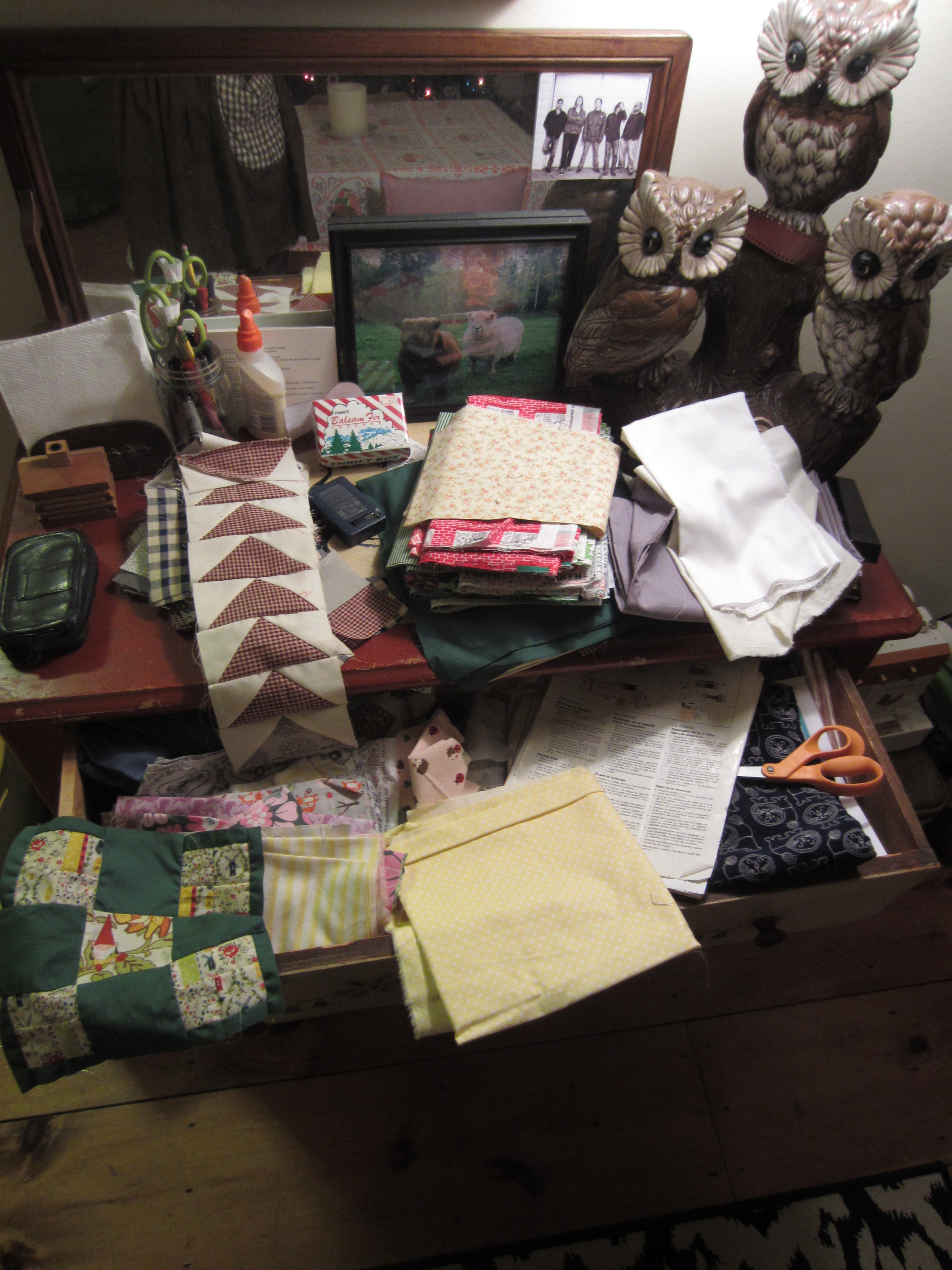 Fabric bins. Or tupperwares, boxes. Or for the luckiest, entire rooms with shelves. In my case, overflowing drawers of fabric in the top half of a folk art dresser. By December, I have assembled a hodge-podge squirrel’s nest of test blocks, unused fat quarters, thrift store fabric finds, and the practically useless, tiny bits of quilt scraps.