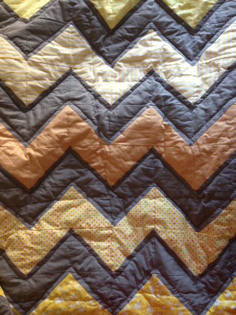 I picked the fabric out for this quilt in New Hampshire, and cut fabric in Maine. Together with my sister and my mom, we assembled this chevron quilt in Cape Cod over a very productive and warm spring weekend. This quilt got my sister into the quilting game; she learned to cut, arrange, and sew the triangles, and I *think* she thought it was actually quite fun. The lucky person to get this quilt will have the one quilt (so far!) that my mom, my sister, and I have all made together.